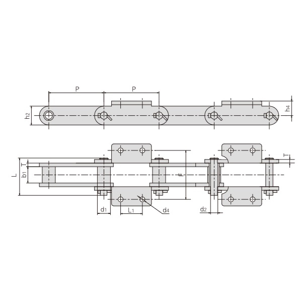 - Płytki łączące w kształcie litery L – pionowa sekcja przymocowana do górnego końca wewnętrznej płytki łańcucha z poziomymi otworami montażowymi – poprawiają rozproszenie obciążenia i zapobiegają deformacji lub uszkodzeniom spowodowanym nierównomierną siłą.