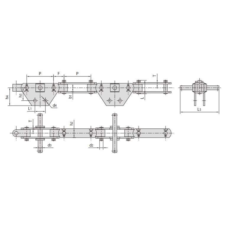 - W celu zwiększenia skoku poza standardowe wartości znamionowe, tuleje między płytkami łańcucha mogą być wzmocnione, z wystarczającym prześwitem w zębach koła łańcuchowego, aby zapewnić bezpieczną i prawidłową pracę.