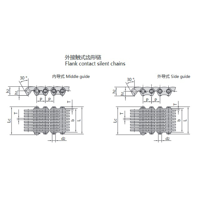 - Zewnętrzny łańcuch zębaty:Zewnętrzny prosty profil zęba na płytce łańcucha zazębia się z zębami koła łańcuchowego, zapewniając stabilną pracę. Charakteryzuje się większymi efektami wielokątnymi, zwiększonymi wstrząsami, wibracjami i hałasem.
