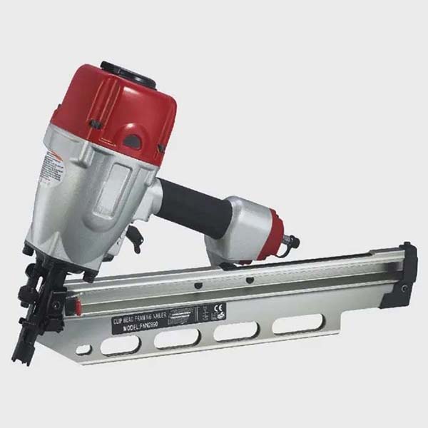 Zasada działania pneumatycznej gwoździarki ramowej:Pneumatyczna gwoździarka ramowa jest zasilana sprężonym powietrzem. Po uruchomieniu strumień powietrza szybko dostaje się do cylindra, popychając tłok w dół z dużą prędkością i wbijając iglicę w celu wbicia gwoździa w drewno. Następnie układ wydechowy uwalnia nadmiar gazu, aby zresetować tłok do następnego strzału. Dzięki gwoździowaniu pod kątem 28°, gwóźdź wchodzi w materiał pod kątem, poprawiając stabilność połączenia i zmniejszając ryzyko rozszczepienia drewna. Konstrukcja typu knockout burst pozwala na ciągłe wbijanie gwoździ bez zwalniania spustu, znacznie zwiększając wydajność.Obszary zastosowań pneumatycznej gwoździarki ramowej: